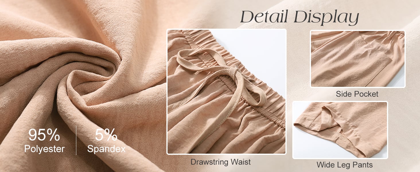 Material:Â These women's wide-leg pants are made of lightweight, breathable, and skin-friendly fabric, drapes well and feels fluid. A popular item especially designed for warm spring, hot summer, and early autumn.